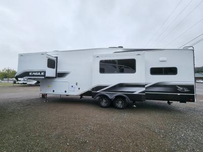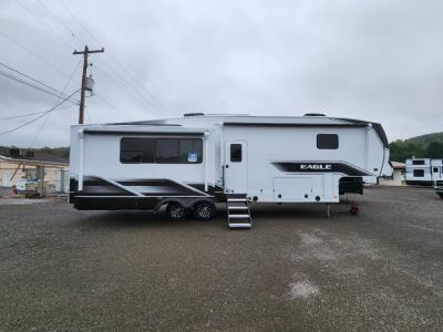 With any Eagle fifth wheel by Jayco you will appreciate durable construction materials, like the Magnum Truss Roof and the Stronghold VBL laminated walls. The JAYCOMMAND Smart RV system puts you in control of your RV's functions, and the 5 Star Handling Package will provide smooth towing from home to camp. Each model features Climate Shield zero-degree tested weather protection and the industry-exclusive HELIX cooling system that features two 15,000 BTU Whisper Quiet A/C's to keep you comfortable year around. Some of the exterior conveniences you are sure to love are the pass-through storage with Slam-Latch baggage doors and an automotive style front cap with max turn radius. The Eagle fifth wheels are designed to make you feel at home with solid hardwood slide fascia, residential vinyl flooring throughout, 100% no floor vents, and blackout roller shades with reflective side throughout for added privacy and insulation.